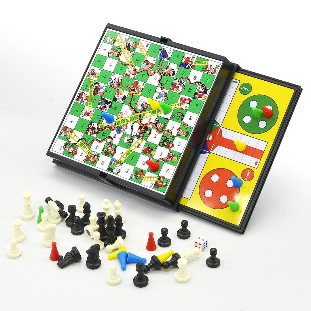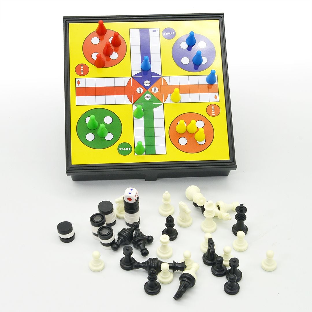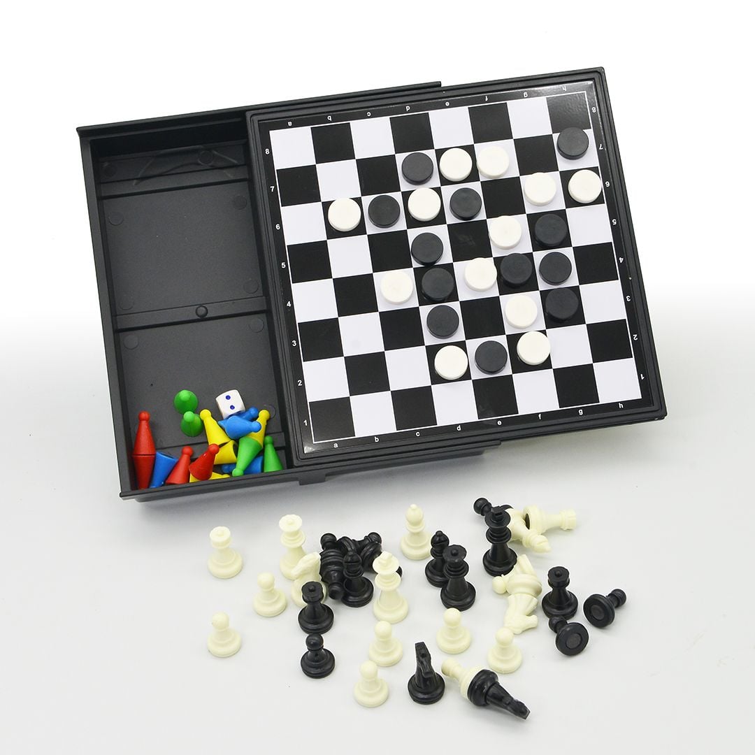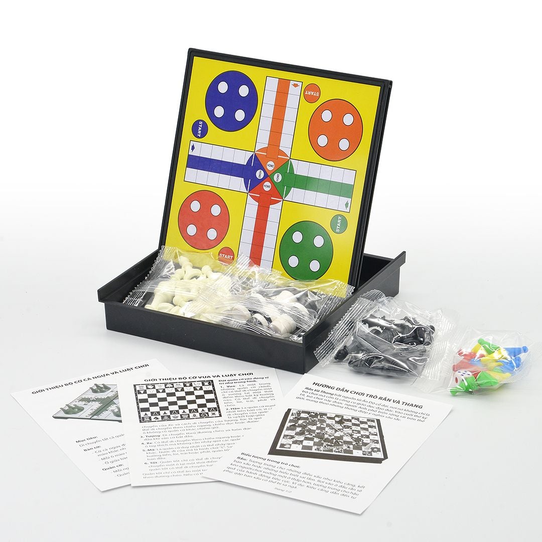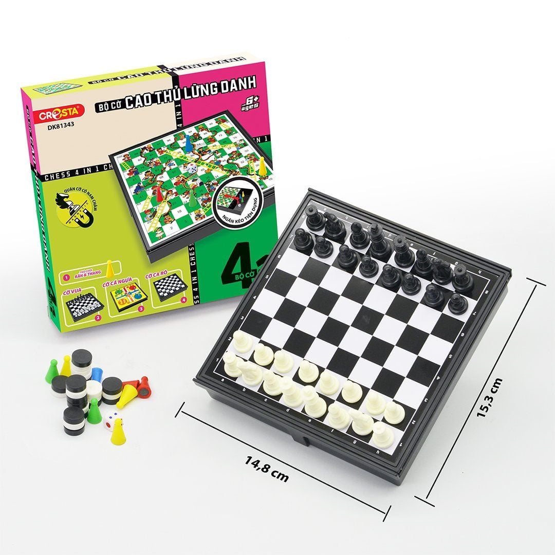 Bàn cờ 4 trong 1 được tích hợp trong 1 bàn cơ như : Cờ vua, cờ caro, cờ cá ngựa, trò chơi rắn & thang.. giúp các bé thỏa sức thi triển và trải nghiệm các bộ môn đầy trí tuệ và sáng tạo này.