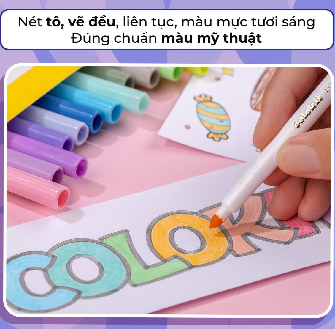 - Mực hệ nước (Washable): Điểm mạnh của Thiên Long Colokit là mực có thể rửa trôi được. Nếu bé vô tình vẽ lên tay hoặc quần áo, bạn có thể dễ dàng làm sạch bằng nước.