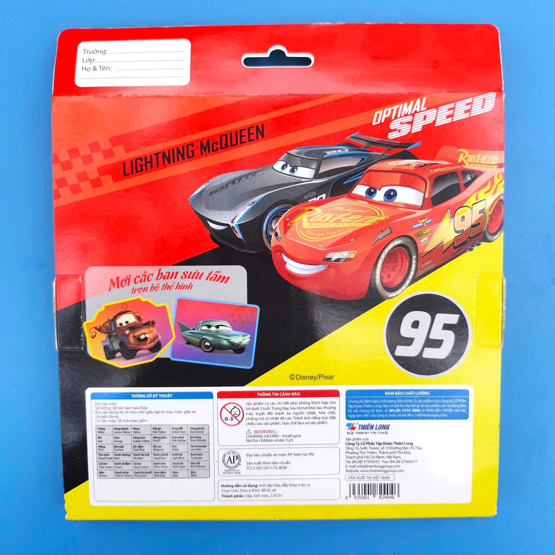 - Hình ảnh bản quyền: Vỏ hộp nổi bật với hình ảnh nhân vật Lightning McQueen (Số 95) mạnh mẽ và tốc độ. Thiết kế này cực kỳ lôi cuốn các bé trai và những fan hâm mộ của dòng phim Cars.