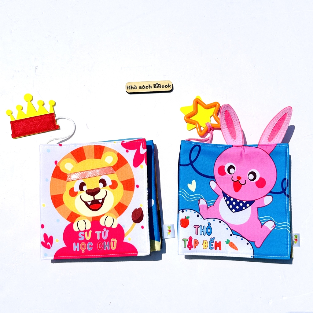 Combo 2 cuốn sách vải Sư tử học chữ, Thỏ tập đếm - có chi tiết tương tác, an toàn dễ giặt vệ sinh cho bé - size cơ bản 15x15 - pipovietnam