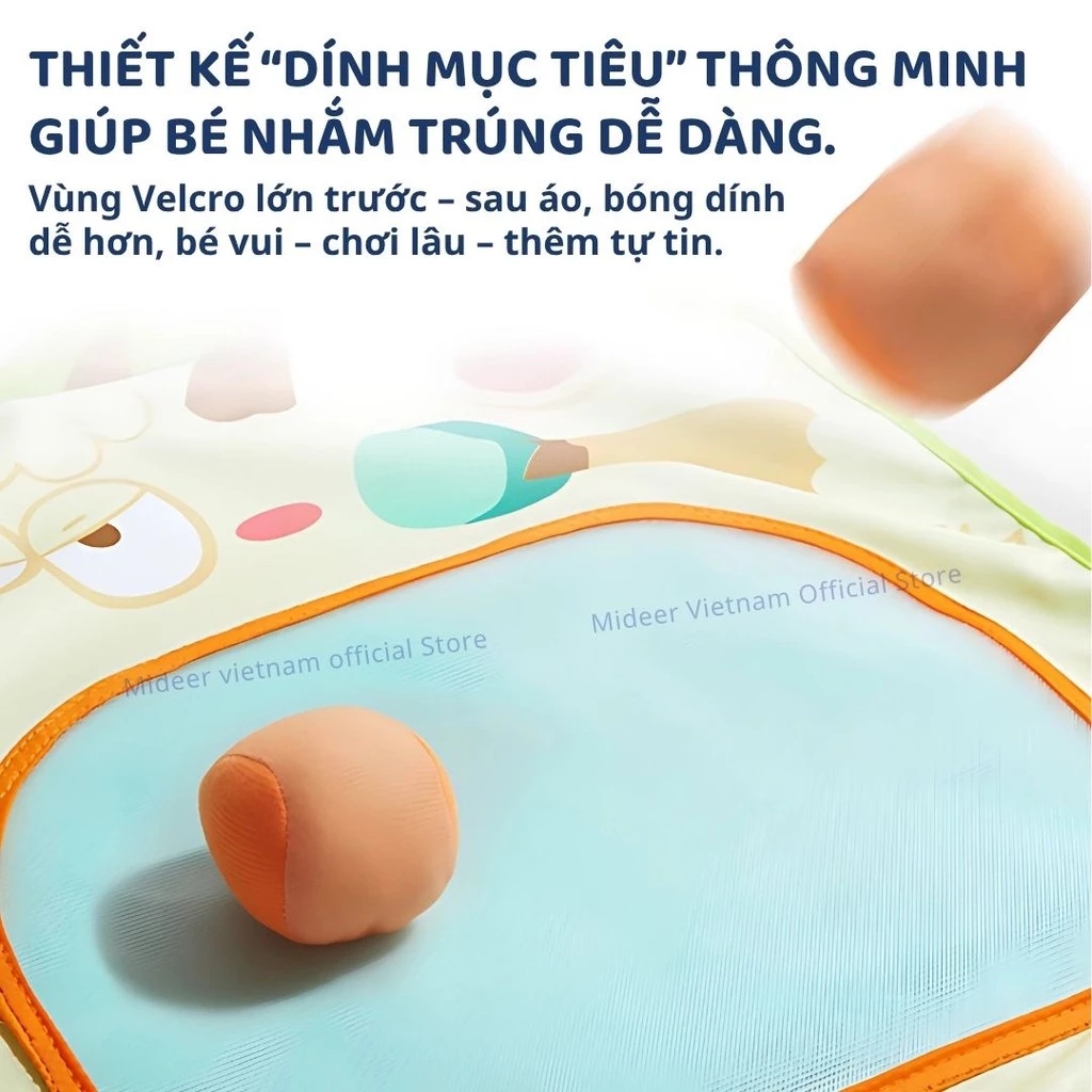 3. THIẾT KẾ “DÍNH MỤC TIÊU” THÔNG MINH – BÉ DỄ NHẮM TRÚNG HƠN: Thiết kế vùng Velcro lớn – Với vùng dán rộng cả mặt trước và sau áo, tỉ lệ bóng dính cao giúp trẻ cảm thấy thành công, tăng động lực chơi lâu hơn.