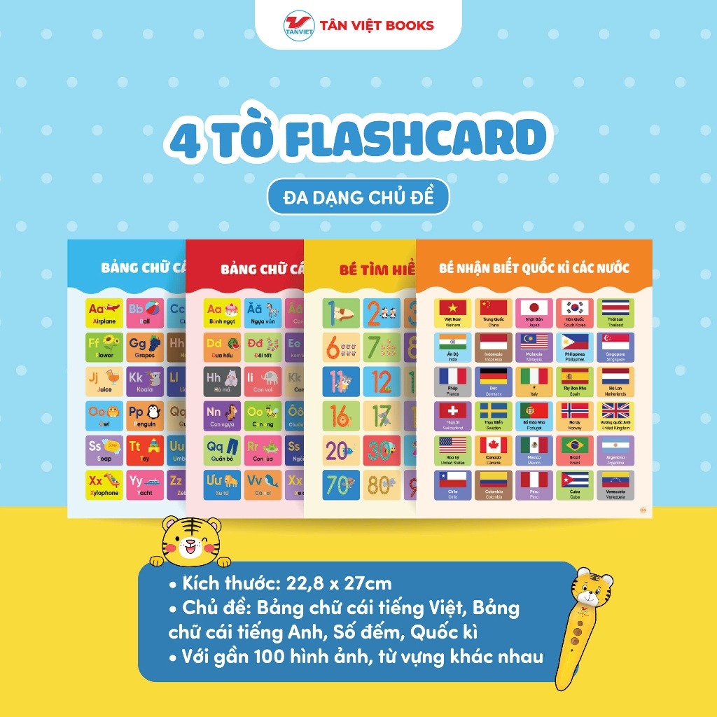 • 4 tờ flashcard khổ lớn (22,8 × 27cm) – bảng chữ cái, số đếm, quốc k/.ỳ