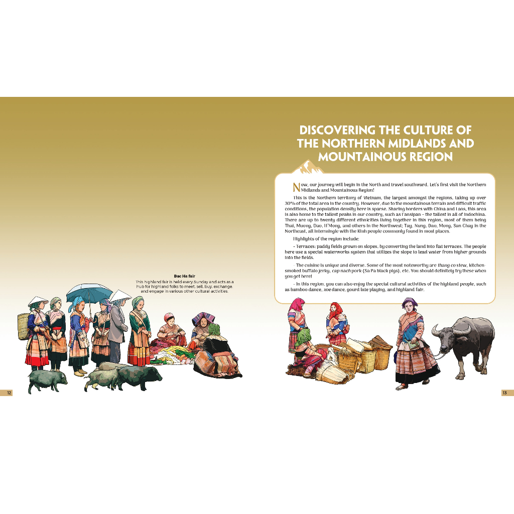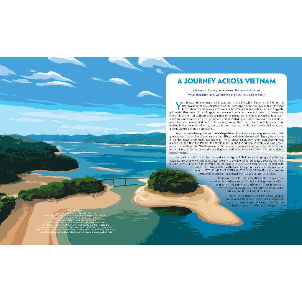 Our goal here is to bring forth a reader-friendly book that covers the geography, history, cultures, and people, suitable to all ages. We aim to provide school students a specific and vivid picture of each region, each province on the map of Vietnam. In every piece of information, illustration, and color palette, lies the love of the proud descendants of our home country. PICTURE ATLAS OF VIETNAM - THE LAND OF CHARM, the journey to discover 63 provinces, has started from a place of such aspiration.